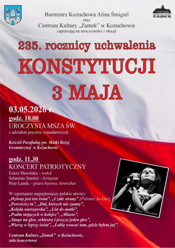 Dalsza część świętowania odbędzie się o godzinie 11:30 w Zamku w Kożuchowie, gdzie zaplanowano Koncert Patriotyczny. Na scenie wystąpią znakomici artyści: Estera Sławińska (wokal), Sebastian Smoleń (fortepian) oraz Piotr Łamik (gitara basowa, kontrabas). W programie znajdą się znane i poruszające utwory patriotyczne zaprezentowane w nowoczesnych aranżacjach, łączących muzyczną wrażliwość z emocjonalnym przekazem.