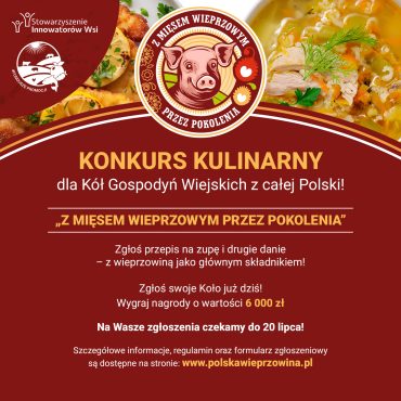 Stowarzyszenie Innowatorów Wsi zaprasza Koła Gospodyń Wiejskich do udziału w I Edycji Ogólnopolskiego Konkursu Kulinarnego pod hasłem „Z mięsem wieprzowym przez pokolenia”. Konkurs ma na celu promowanie polskiej wieprzowiny oraz ukazanie jej roli w domowej kuchni – tej codziennej i świątecznej. To niepowtarzalna okazja, by zaprezentować kulinarne dziedzictwo swojej miejscowości, podzielić się rodzinnymi przepisami i […]