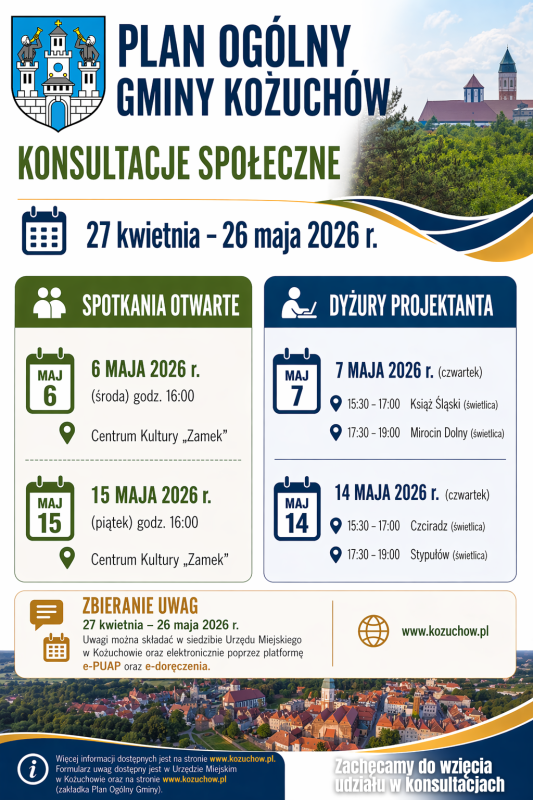 Trwają prace nad Planem Ogólnym Gminy Kożuchów. Rozpoczęły się konsultacje społeczne dotyczące przygotowania dokumentu o kluczowym znaczeniu dla kształtowania polityki przestrzennej oraz kierunków rozwoju całej gminy. Konsultacje prowadzone są w terminie od 27 kwietnia do 26 maja 2026 r.