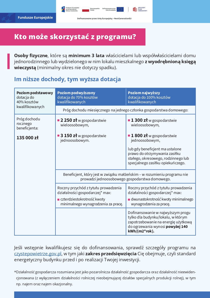 Dofinansowanie jest dostępne dla osób fizycznych spełniających określone kryteria dochodowe.